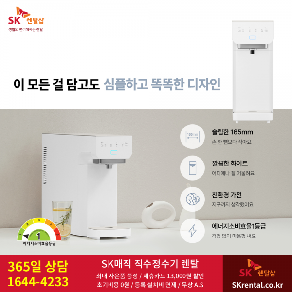 #SK직수정수기 #스스로케어 #전해수살균 #유로순환케어 #100도씨온수 #컵라면조리 #나노필터 #미네랄유지 #중금속제거 #새집입주 #결혼혼수 #매장오픈 #사무실개업 #최대혜택
