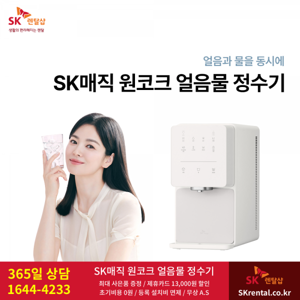원코크얼음정수기, 송혜교모델, 동시출수, 제빙기, 아이스룸, 무상교체, 직수방식, 방문케어, 자가관리, 분리세척, 전해수살균, 유로순환케어, 스테인리스유로, 100도씨, 초고온수